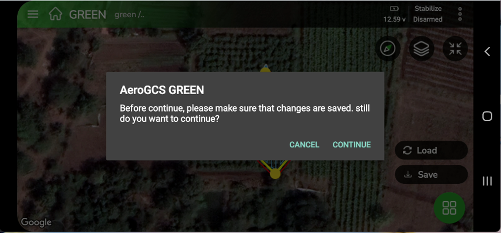 **Step** **3**. Select the "**Load**" button to initiate the plan for the flight. A confirmation prompt will appear on the screen saying, “**Please make sure the changes are saved**” with “**Cancel**” and “**Continue**” buttons, as depicted below.