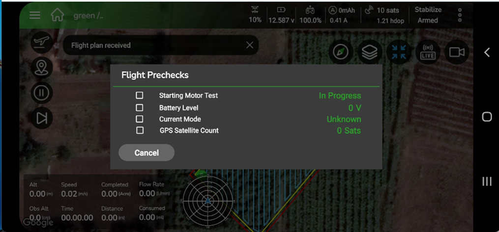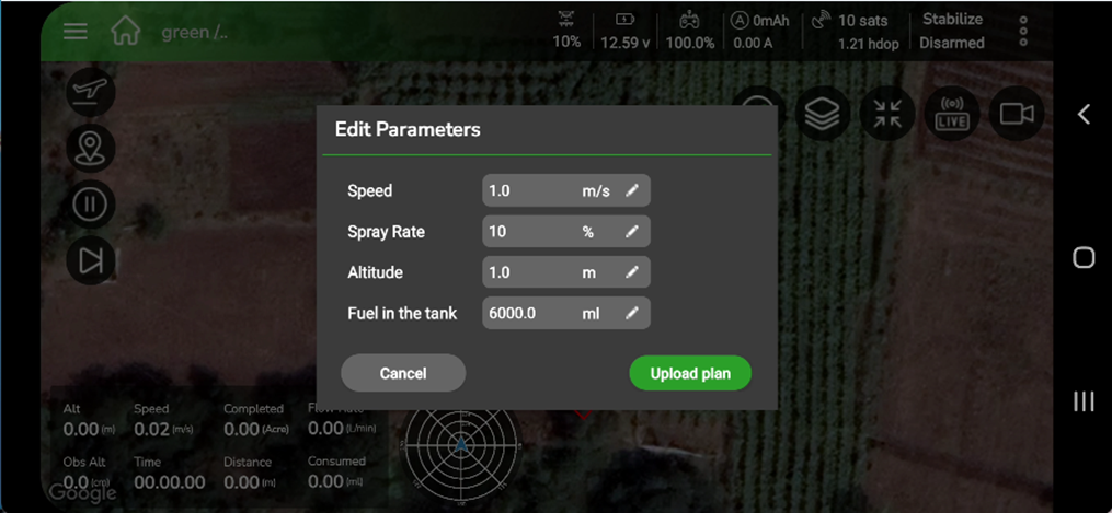 If desired, modify the parameters on this screen. Click on "Upload plan" to upload the plan and proceed with flight prechecks, as illustrated in the following screen.