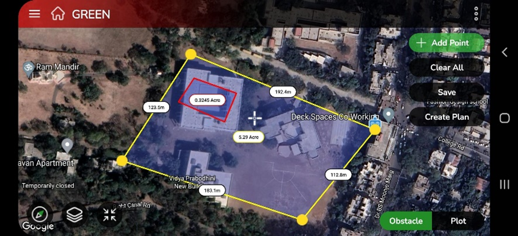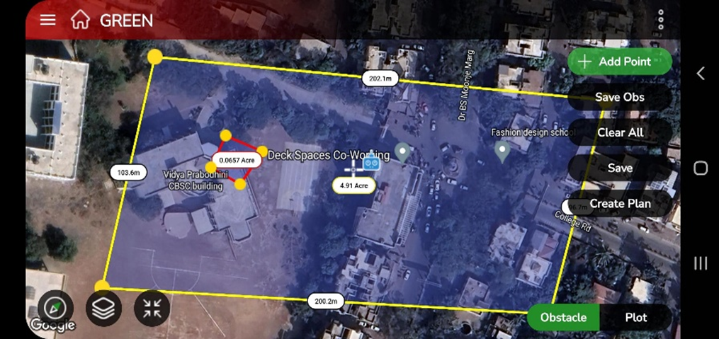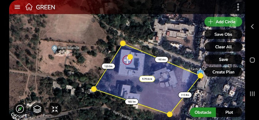 4. **Obstacle**: This option is used to add obstacles to the plot. Tap on “Obstacle” to add an obstacle to the plot. Users can add polygon and circle types of Obstacles to the user’s plot.