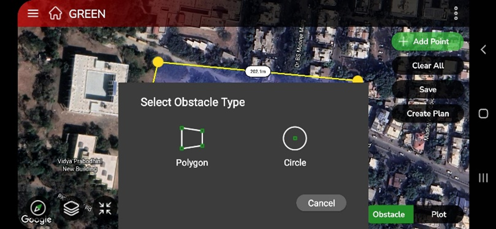 4. **Obstacle**: This option is used to add obstacles to the plot. Tap on “Obstacle” to add an obstacle to the plot. Users can add polygon and circle types of Obstacles to the plot.