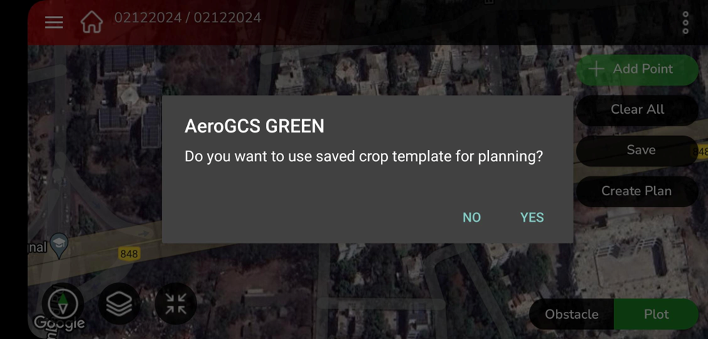 * **\`Tap on the&#x20;*****Create Plan*****&#x20;Button**. A confirmation dialog appears with the message: **"Do you want to use a saved crop template for planning?"**&#x20;