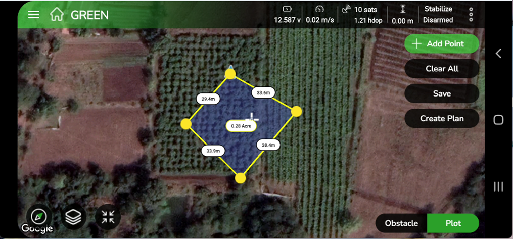 By default, this view or screen displays the process of plotting points for a plot using Google Maps. Additionally, the screen offers the following options for users: