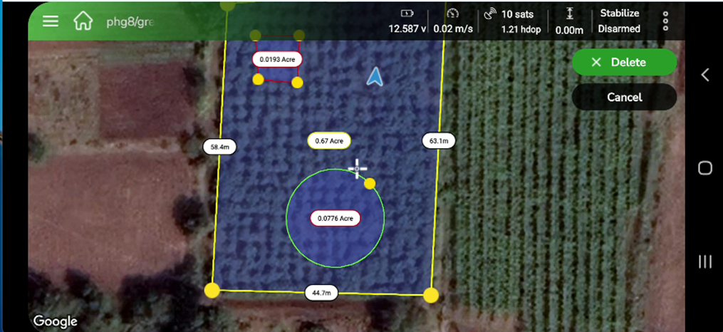 To remove an obstacle from the plot, simply tap on the edge of the obstacle. This action will mark the obstacle for deletion, indicated by the edge turning green, and a delete button will appear, as illustrated in the following screen.&#x20;