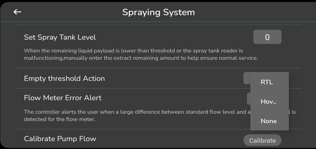 This parameter triggers a warning message when the payload in the spray tank reaches the preset threshold. Users can configure the empty threshold action as follows: