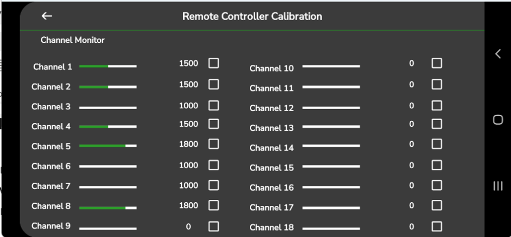 The following screen will display the current live values for the selected channel as the user moves the stick on the connected remote controller, as illustrated in the following screen.&#x20;